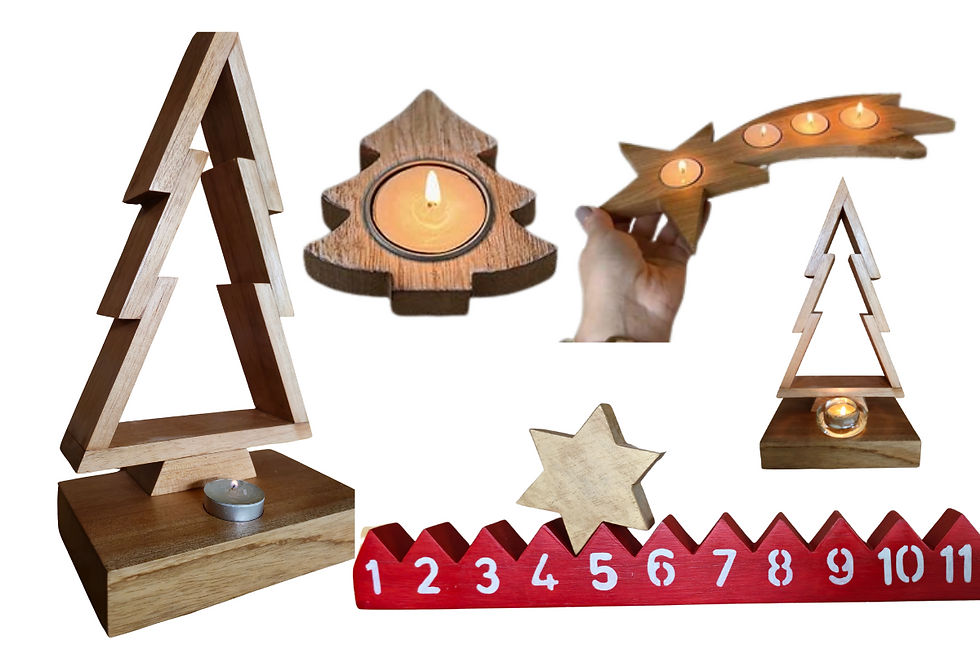 Decoración navideña en madera hecha a mano: árboles portavelas, estrellas portavelas, calendario de adviento navideño y adornos únicos para tu hogar en Navidad.